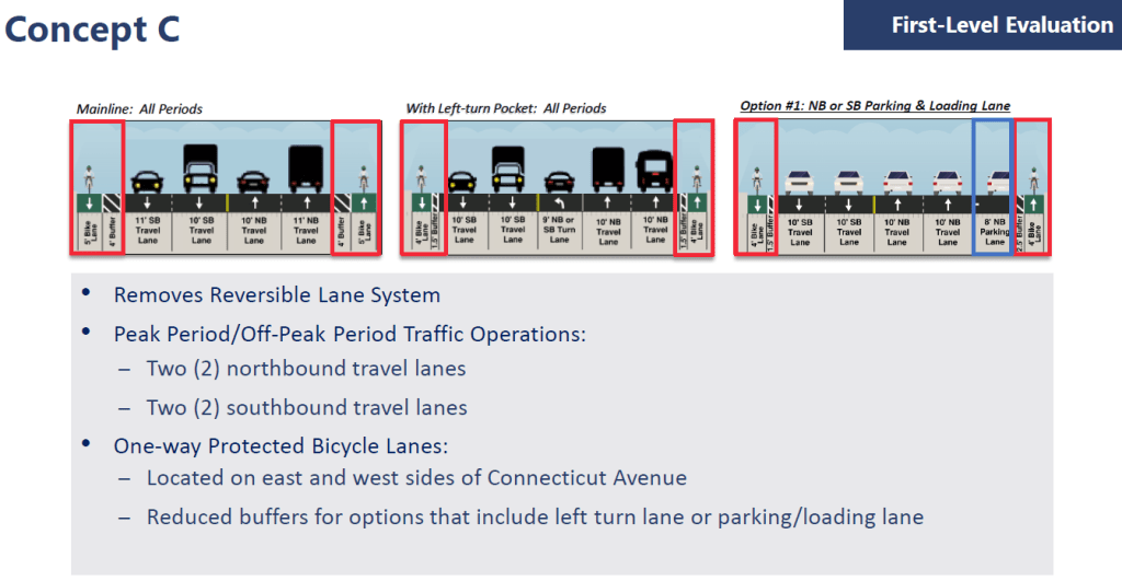 Next week ANCs 3C (Mon 4/19) and 3F (Tues 4/20) will be considering resolutions about the safety redesign of Connecticut Ave. Both ANC resolutions are recommending Concept C (bike lanes with some commercial area parking and left turn lanes) as the safest option.