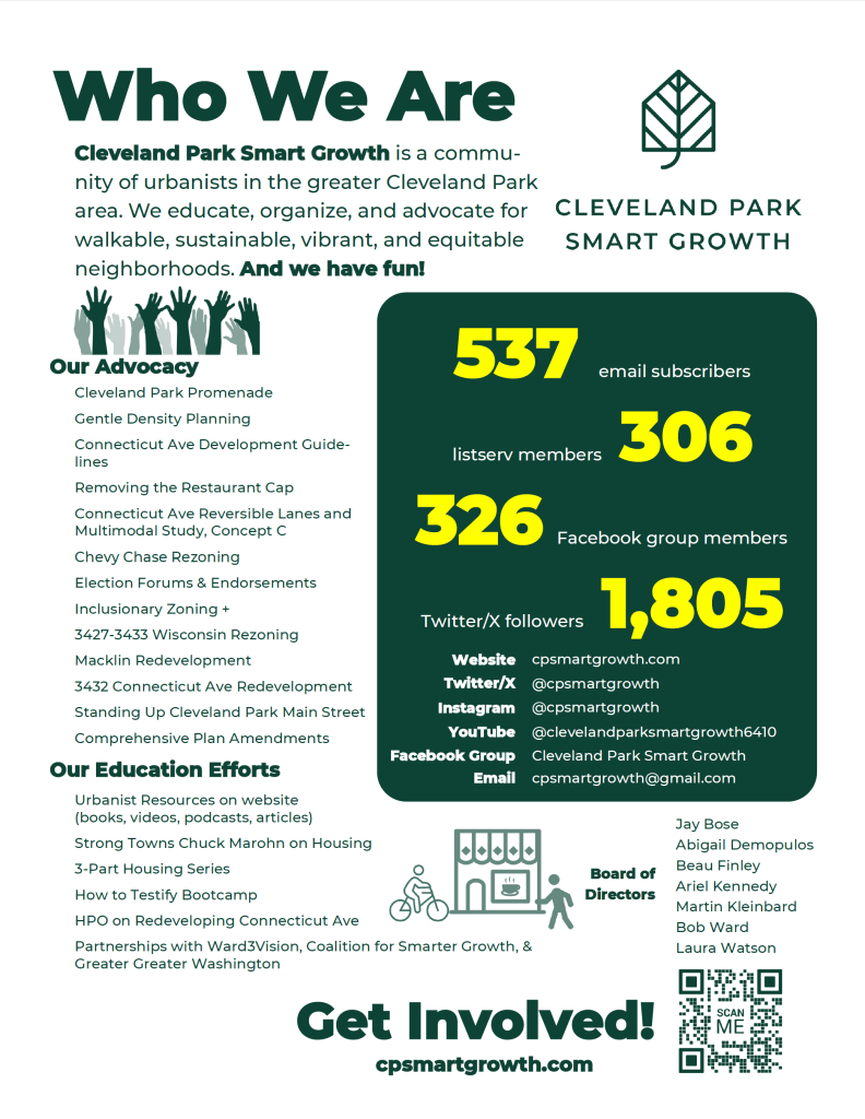 Cleveland Park Smart Growth will have a table by the Uptown theater during Cleveland Park Day, which is Sunday, June 2, 2024 from Noon to 5pm.