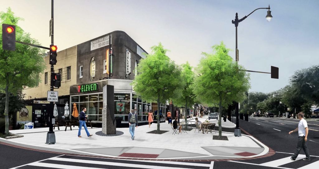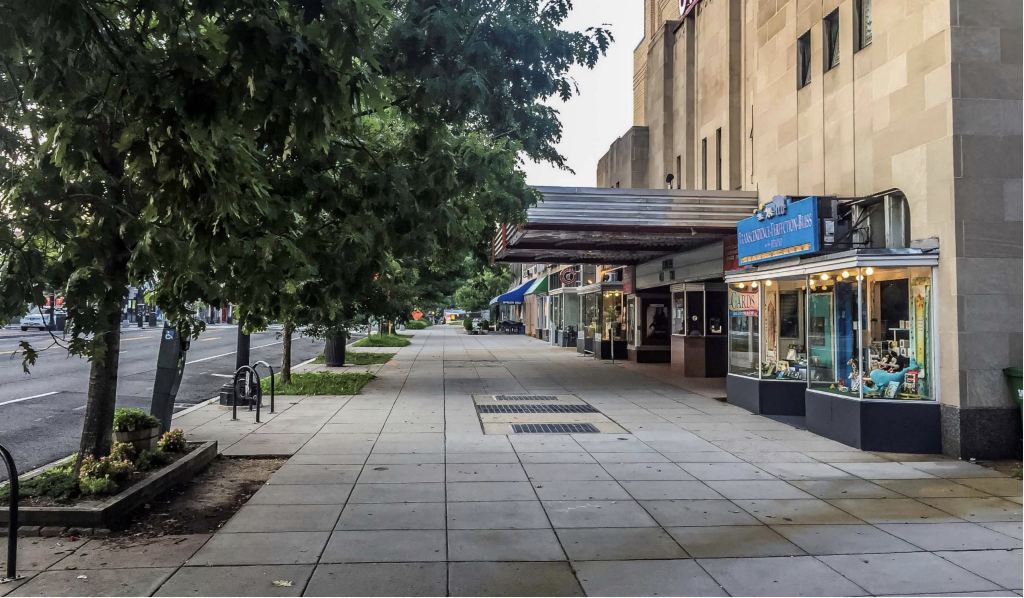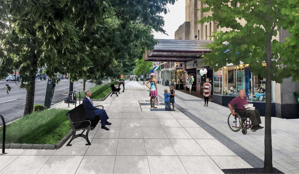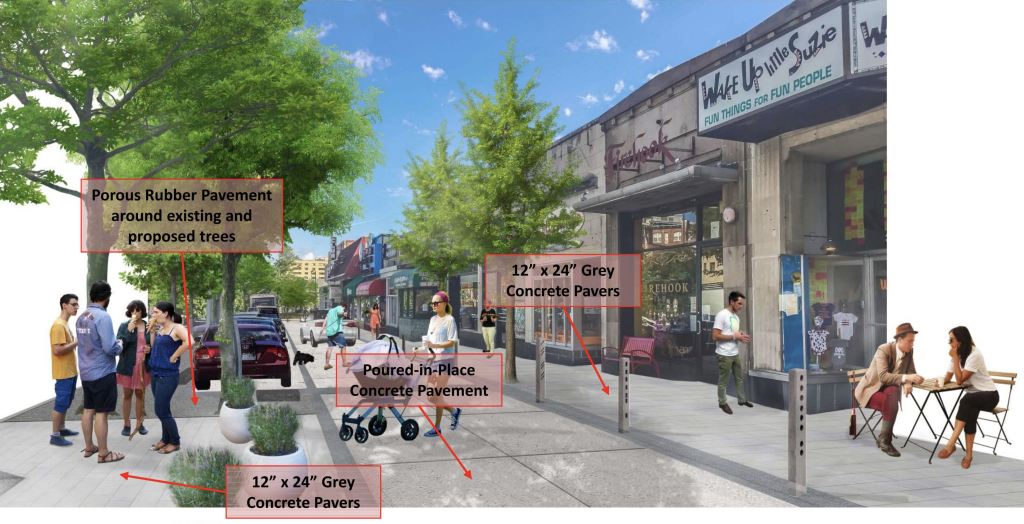Overall the design of the sidewalks will be unified and unique to Cleveland Park, with design influenced by the design of the Uptown Theater. Street art, furniture, trees and bioswales have been incorporated into the redesign.