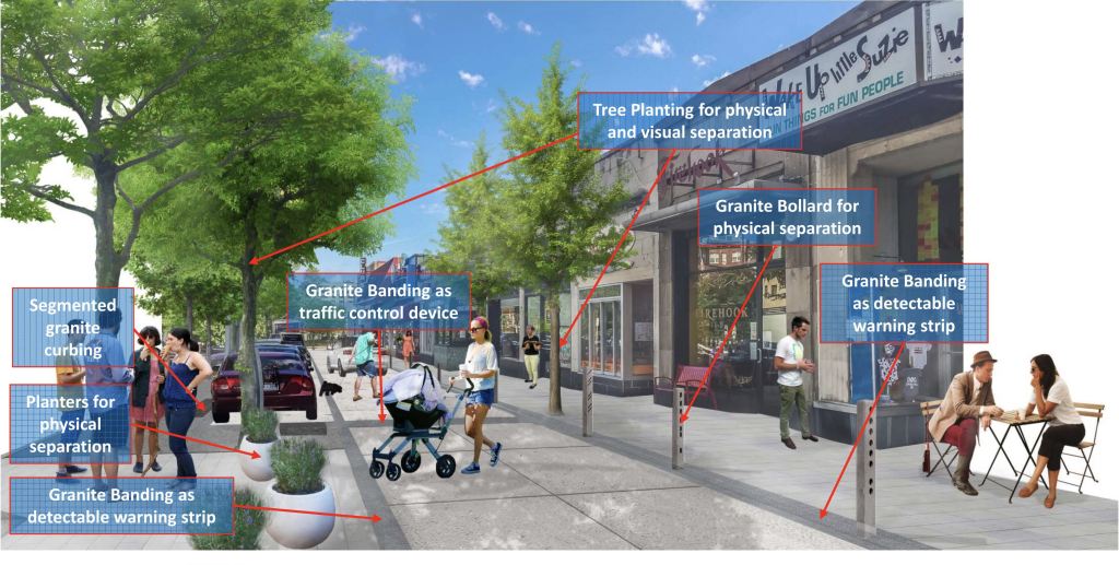 One of the big changes to the streetscape will be raising the service lane to sidewalk level creating a woonerf – a shared road – where the pedestrian will have the right of way at all times. The narrow sidewalk would be a refuge protected by bollards spaced ten feet apart, while differential paving will demark the driving and and parking lanes for vehicles. The single-level service lane will be ready made for streatery and pedestrian-only use if the decision is made to bar cars from the lane for planned events, regular periodic closures such as weekends or to close if to car traffic permanently.